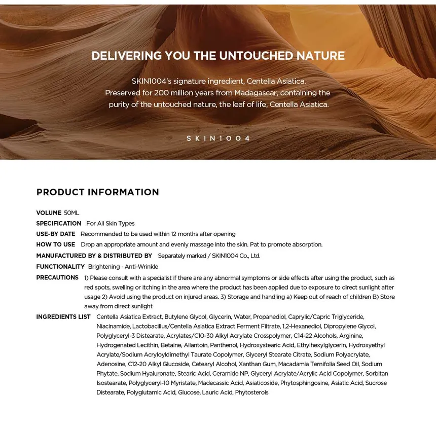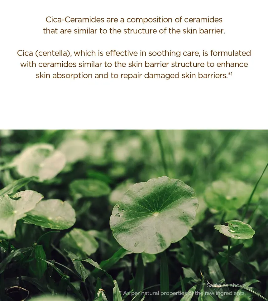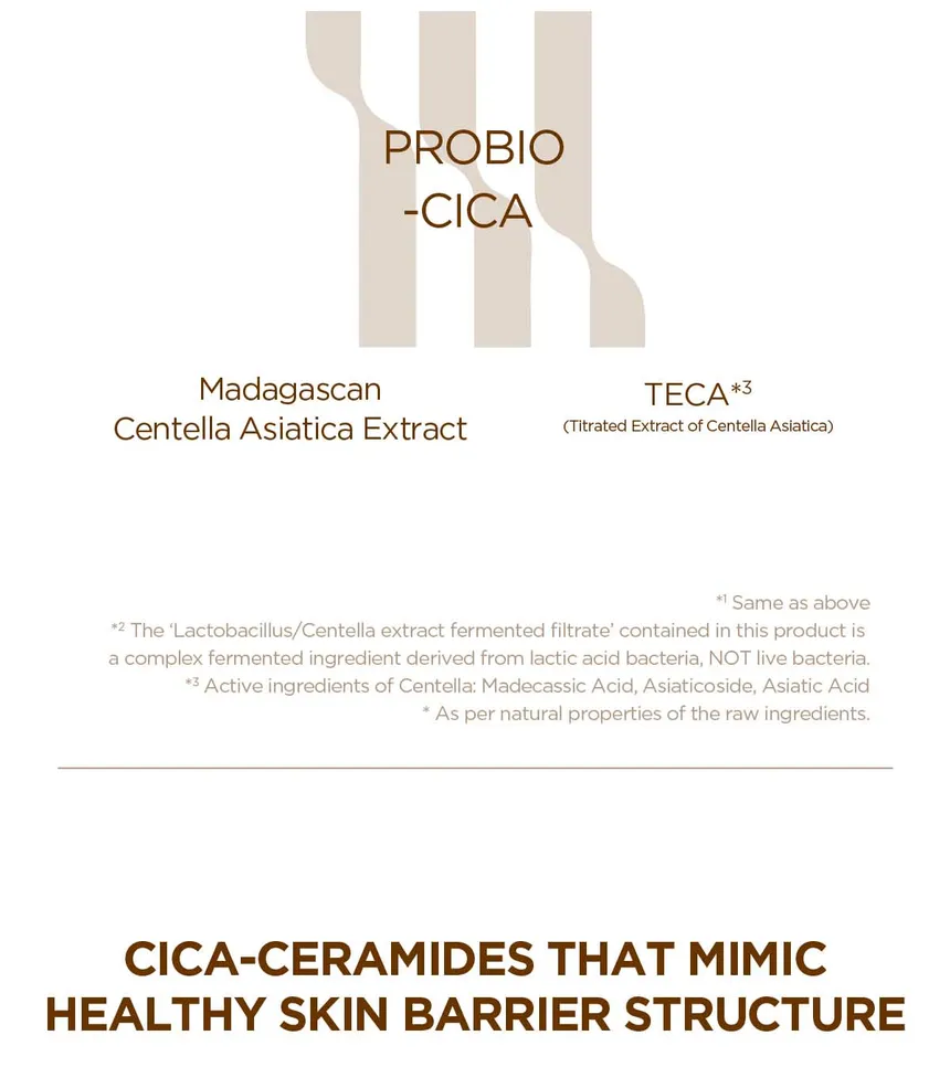 Centella Asiatica Extract, Butylene Glycol, Glycerin, Water, Propanediol, Caprylic/Capric Triglyceride, Niacinamide, Lactobacillus/Centella Asiatica Extract Ferment Filtrate, 1,2-Hexanediol, Dipropylene Glycol, Polyglyceryl-3 Distearate, Acrylates/C10-30 Alkyl Acrylate Crosspolymer, C14-22 Alcohols, Arginine, Hydrogenated Lecithin, Betaine, Allantoin, Panthenol, Hydroxystearic Acid, Ethylhexylglycerin, Hydroxyethy Acrylate/Sodium Acryloyldimethyl Taurate Copolymer, Glyceryl Stearate Citrate, Sodium Polyacrylate, Adenosine, C12-20 Alkyl Glucoside, Cetearyl Alcohol, Xanthan Gum, Macadamia Ternifolia Seed Oil, Sodium Phytate, Sodium Hyaluronate, Stearic Acid, Ceramide NP, Glyceryl Acrylate/Acrylic Acid Copolymer, Sorbitan lsostearate, Polyglycery-10 Myristate, Madecassic Acid, Asiaticoside, Phytosphingosine, Aslatic Acid, Sucrose Distearate, Polyglutamnic Acid, Glucose, Lauric Acid, Phytosterols